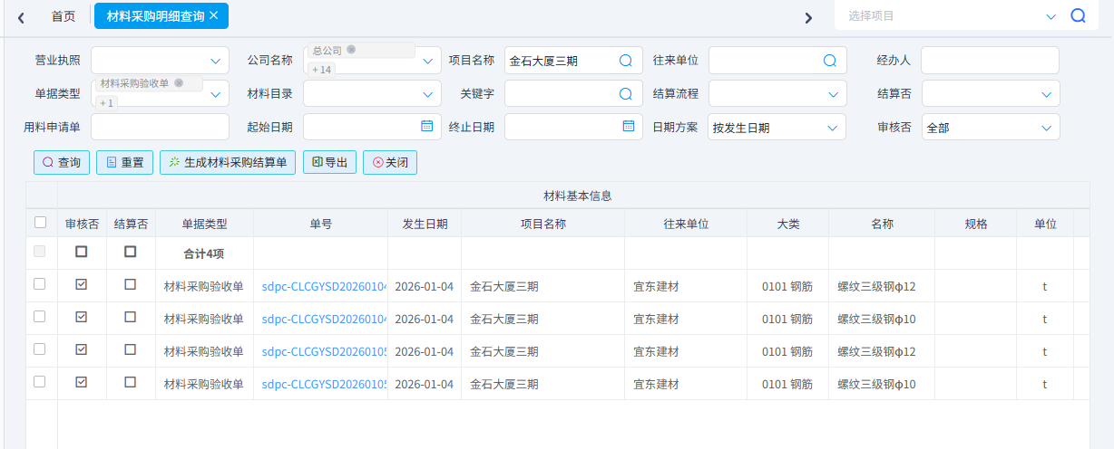 用于查詢所有類型的材料單據(jù)的內(nèi)容明細(xì)。該功能可滿足關(guān)于材料明細(xì)的任何形式任何條件的查詢。可以按照單據(jù)類型、項(xiàng)目名稱、供應(yīng)商、材料名稱、時(shí)間等條件進(jìn)行篩選。可以導(dǎo)出Excel表格。