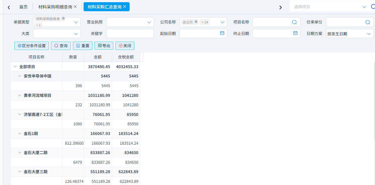 用于按照項(xiàng)目匯總材料采購(gòu)總數(shù)量和總金額