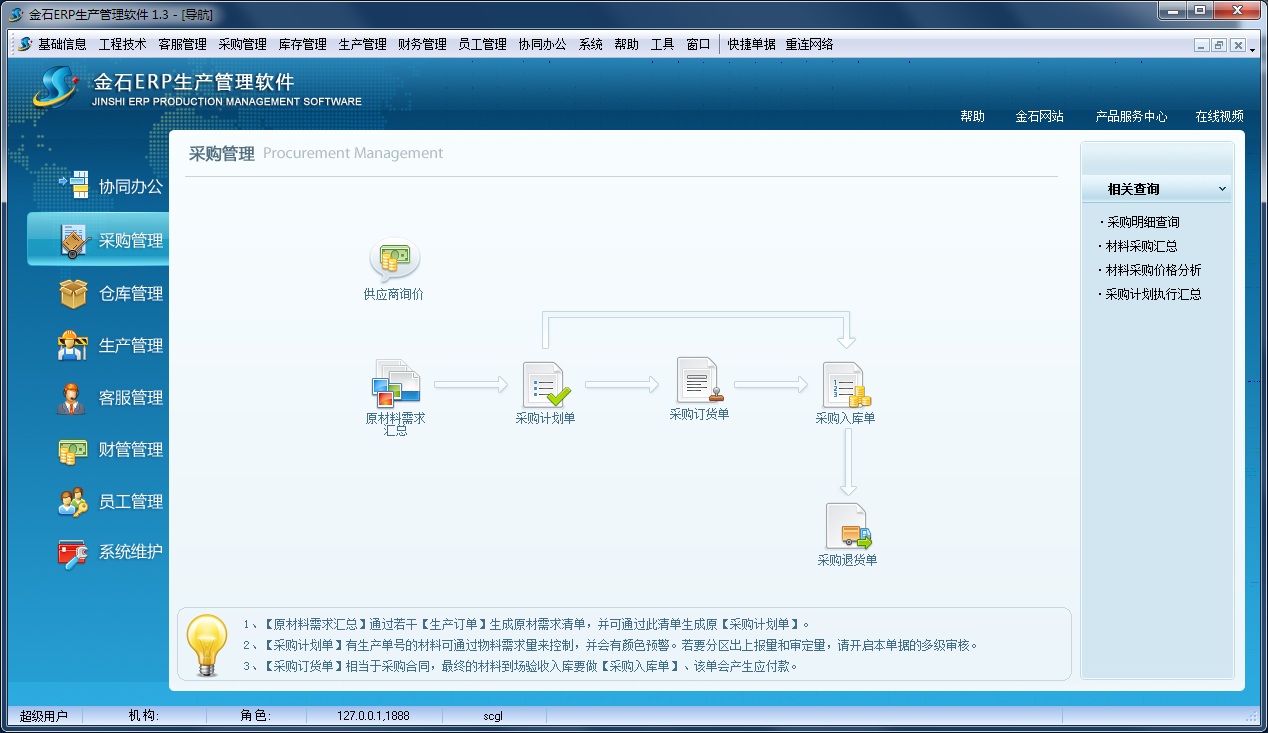采購管理主要完成從客戶訂單生成原材料需求匯總,到最終簽訂采購合同,驗(yàn)收入庫的過程。