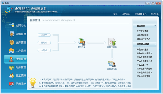 主要是完成和客戶訂單有關(guān)的工作,包括設(shè)定客戶訂單的狀態(tài)、銷售出庫、銷售退貨,對(duì)客戶銷售情況統(tǒng)計(jì)報(bào)表等。