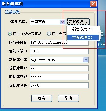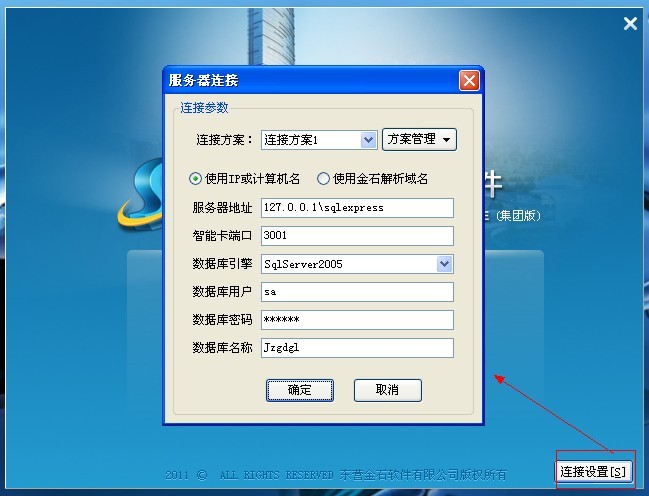 在彈出的窗口中填寫(xiě)好:服務(wù)器ip地址、智能卡端口、數(shù)據(jù)引擎、數(shù)據(jù)庫(kù)用戶、數(shù)據(jù)庫(kù)密碼、數(shù)據(jù)庫(kù)名稱。